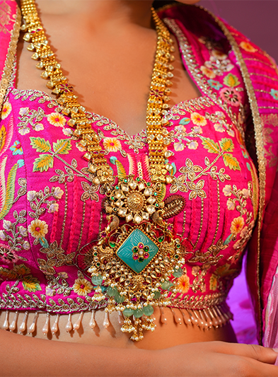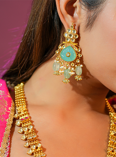 The Aasmani Haar is an extraordinary piece of jewelry that radiates elegance and tradition. This long, regal necklace features finely crafted gold details combined with striking turquoise-blue accents that evoke the beauty of the sky. The central pendant is adorned with intricate patterns and gemstone embellishments, making it the focal point of the piece. Perfect for weddings, cultural celebrations, and grand events, the Aasmani Haar embodies luxury and heritage. Its unique color scheme and refined craftsmanship add a touch of opulence, making it an essential statement accessory for any traditional attire.