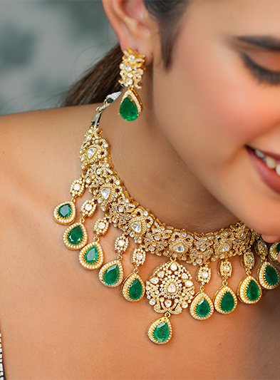 This luxurious necklace set features an intricate gold design accented by dazzling green gemstone drops, creating an exquisite blend of elegance and opulence. The necklace is complemented by matching earrings that carry the same intricate detailing and vibrant green stones, adding harmony and sophistication to the set. Perfect for weddings, festive celebrations, and grand occasions, this set exudes timeless beauty and regal charm. Its meticulous craftsmanship and striking color combination make it a show-stopping accessory that enhances any traditional attire with grace and distinction.