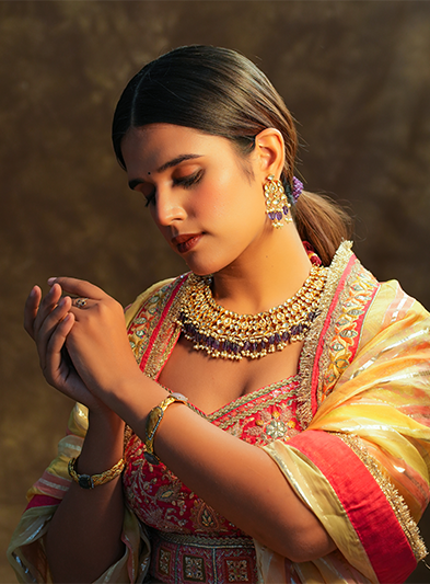 This elegant jewelry set features a beautifully layered necklace adorned with intricate detailing and a blend of traditional and modern design elements. The necklace is paired with matching drop earrings that enhance its regal and sophisticated look. Perfect for weddings, festive celebrations, and grand occasions, this set embodies a luxurious appeal and refined craftsmanship. The subtle use of gemstone accents adds a touch of color and sparkle, making it a standout accessory for those who appreciate timeless beauty and elegance.