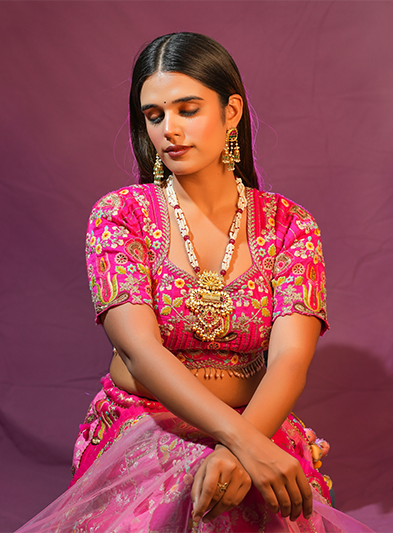 The Sunheri Mehfil Necklace is a captivating piece that embodies grandeur and traditional allure. This necklace features a rich combination of gold and gemstone detailing, highlighted by an intricately crafted central pendant that exudes opulence. The unique arrangement of beads and embellishments adds depth and elegance, making it perfect for weddings, festivals, and grand celebrations. The Sunheri Mehfil Necklace brings a touch of heritage and regal sophistication to any ensemble, ensuring the wearer stands out with timeless beauty and grace.