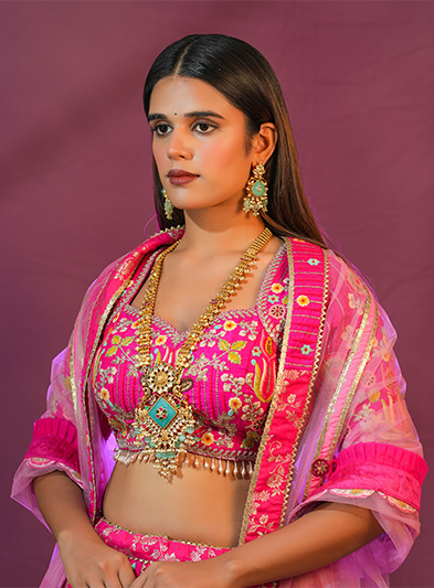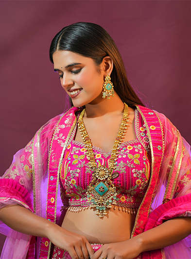 The Aasmani Haar is an extraordinary piece of jewelry that radiates elegance and tradition. This long, regal necklace features finely crafted gold details combined with striking turquoise-blue accents that evoke the beauty of the sky. The central pendant is adorned with intricate patterns and gemstone embellishments, making it the focal point of the piece. Perfect for weddings, cultural celebrations, and grand events, the Aasmani Haar embodies luxury and heritage. Its unique color scheme and refined craftsmanship add a touch of opulence, making it an essential statement accessory for any traditional attire.