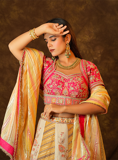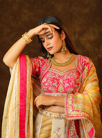 This round necklace features an elegant design with a timeless appeal, showcasing intricate gold detailing interspersed with subtle green accents that add a hint of color and sophistication. Paired with matching statement earrings adorned with similar motifs and beadwork, this set is perfect for enhancing your traditional attire for weddings, festive events, and cultural celebrations. The harmonious combination of classic and modern elements ensures that this necklace set is a versatile addition to any jewelry collection, exuding charm and grace.