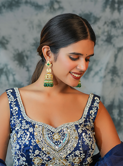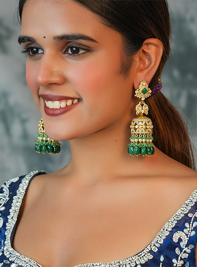 These stunning earrings feature a luxurious blend of gold with intricate Kundan work and vibrant green beads, creating a regal and traditional look. The detailed craftsmanship is perfect for enhancing your attire during festive celebrations, weddings, or special occasions. Their bold yet elegant design ensures that they are a statement accessory, adding a touch of grandeur and elegance to any ensemble.