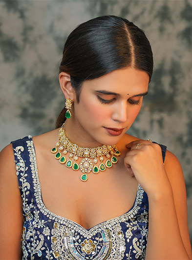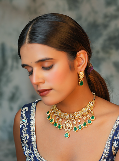 This luxurious necklace set features an intricate gold design accented by dazzling green gemstone drops, creating an exquisite blend of elegance and opulence. The necklace is complemented by matching earrings that carry the same intricate detailing and vibrant green stones, adding harmony and sophistication to the set. Perfect for weddings, festive celebrations, and grand occasions, this set exudes timeless beauty and regal charm. Its meticulous craftsmanship and striking color combination make it a show-stopping accessory that enhances any traditional attire with grace and distinction.