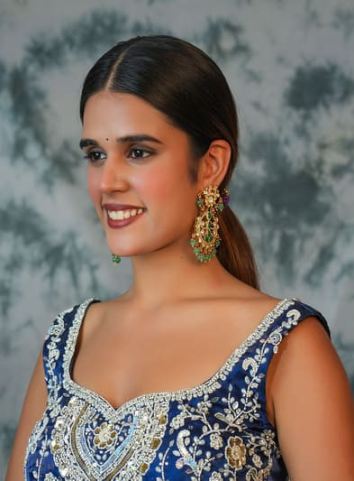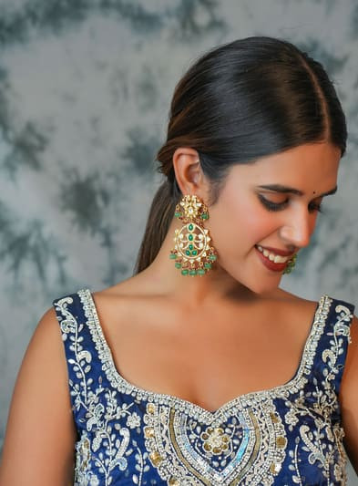 The Emerald Peacock Chandbalis are an exquisite pair of earrings that capture the majestic beauty of traditional Indian jewelry. These chandbalis are adorned with intricate gold detailing and vibrant emerald accents, creating a striking and elegant look. The design features peacock motifs, symbolizing grace and beauty, while the delicate green beadwork adds movement and charm. Perfect for weddings, festive occasions, and cultural celebrations, these chandbalis enhance any ensemble with their regal and sophisticated appeal. The Emerald Peacock Chandbalis are a must-have for those seeking to make a bold yet elegant statement.