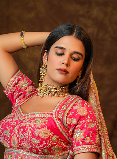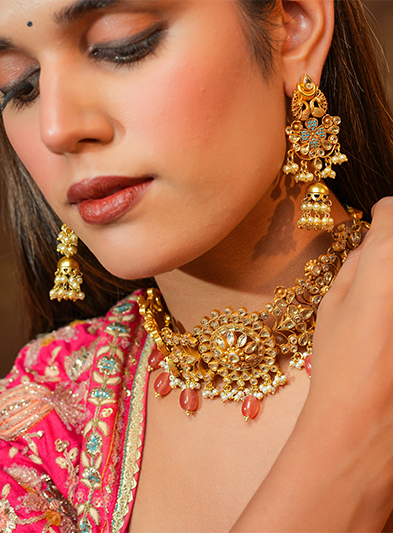 The Golden Gharana choker set exudes an air of regal heritage and timeless elegance. This magnificent choker is adorned with detailed gold craftsmanship and accented with delicate gemstones, creating a luxurious and intricate design. Paired with matching statement earrings that echo the choker's motifs, the set is perfect for weddings, traditional celebrations, and grand occasions. The Golden Gharana embodies the essence of royalty and cultural richness, ensuring that the wearer stands out with unmatched grace and sophistication, making it an essential piece for those who appreciate fine, heritage-inspired jewelry.