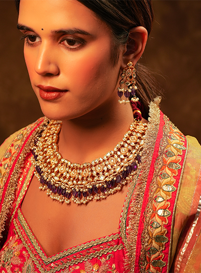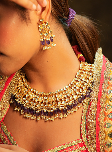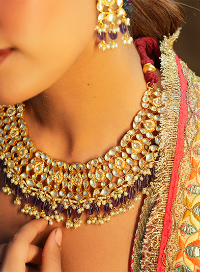 This elegant jewelry set features a beautifully layered necklace adorned with intricate detailing and a blend of traditional and modern design elements. The necklace is paired with matching drop earrings that enhance its regal and sophisticated look. Perfect for weddings, festive celebrations, and grand occasions, this set embodies a luxurious appeal and refined craftsmanship. The subtle use of gemstone accents adds a touch of color and sparkle, making it a standout accessory for those who appreciate timeless beauty and elegance.