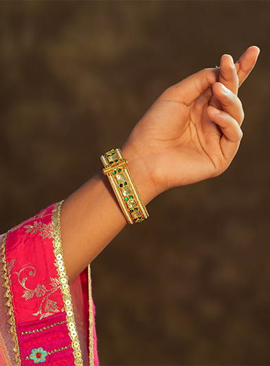 This elegant bangle showcases the timeless art of Kundan and Meenakari work. The delicate detailing, featuring rich enamel and intricately set gemstones, exudes a regal charm that is perfect for traditional celebrations and formal occasions. Its luxurious craftsmanship adds a touch of sophistication, making it an essential accessory for those who appreciate heritage jewelry with a modern flair.