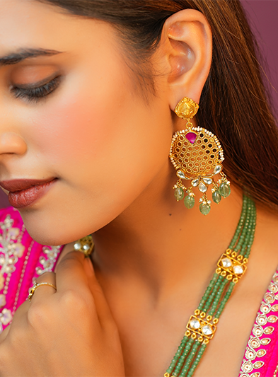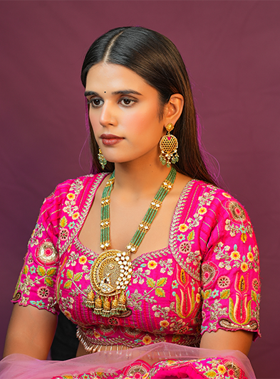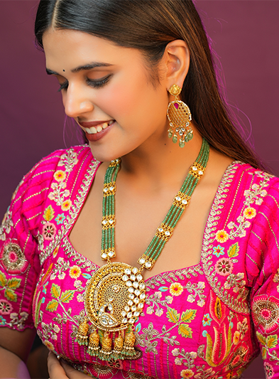 This stunning necklace features an intricately designed gold pendant, adorned with exquisite detailing that reflects traditional artistry. The pendant is complemented by vibrant green beads that add a touch of color and elegance, enhancing the overall appeal of the piece. Perfect for festive occasions, weddings, and cultural celebrations, this necklace embodies a blend of classic charm and regal sophistication. The meticulous craftsmanship and ornate motifs make it a standout accessory that elevates any traditional attire, showcasing the wearer's refined taste and appreciation for heritage jewelry.