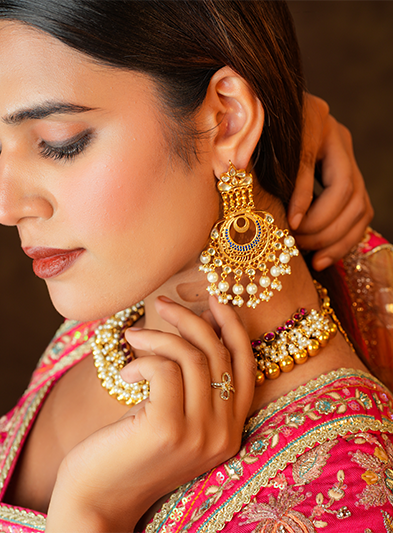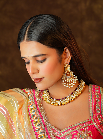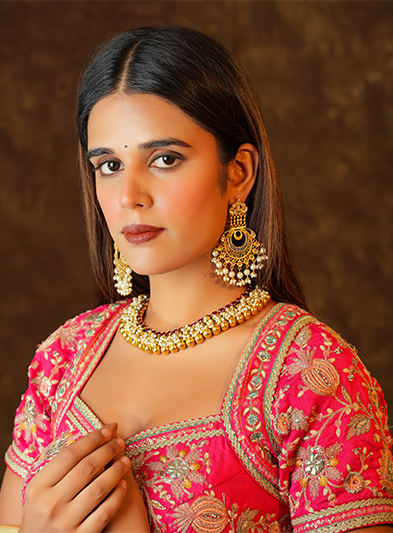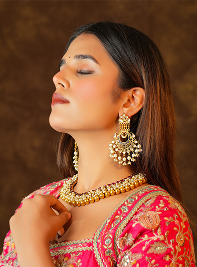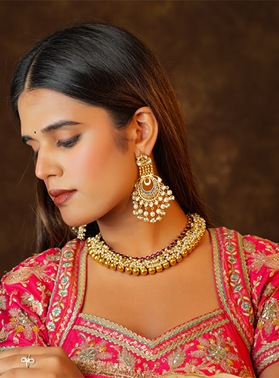 This exquisite jewelry set features a classic round necklace, crafted with meticulous gold detailing and an elegant, timeless design. The necklace is accompanied by matching statement earrings that mirror the intricate patterns and craftsmanship, adding harmony to the ensemble. Perfect for weddings, traditional ceremonies, and festive occasions, this set embodies the essence of luxury and tradition. The balanced blend of sophistication and heritage makes it a must-have piece for those who appreciate fine, artisanal jewelry.