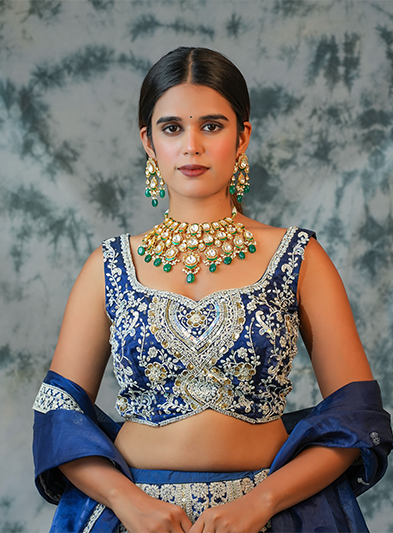 This luxurious bridal jewelry set showcases an opulent design, featuring a stunning necklace adorned with shimmering uncut diamonds and vibrant green accents that enhance its regal appeal. The matching earrings echo the same intricate craftsmanship, highlighted by beautiful green drops that add movement and elegance. Perfect for brides who seek a blend of traditional beauty and contemporary elegance, this set is ideal for weddings and grand occasions. Its dazzling combination of gold and gemstone details ensures that the bride radiates sophistication and grace on her special day.