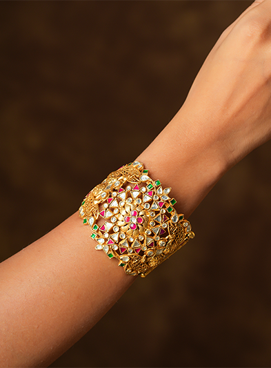 This stunning bracelet is a masterpiece of traditional jewelry design, featuring intricate gold work adorned with multicolored gemstones. The ornate pattern showcases a blend of elegance and heritage, making it a statement piece that is perfect for special occasions and festive celebrations. Its elaborate craftsmanship reflects timeless beauty, adding a regal touch to any attire.