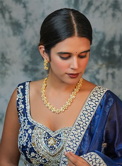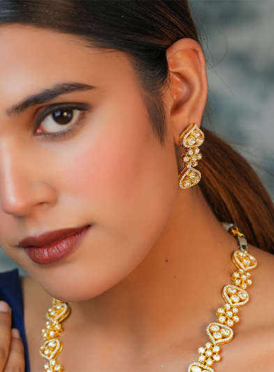 The Starlight Polki Necklace is a masterpiece of elegance, featuring meticulously set Polki stones that shimmer like stars in the night sky. This single-line necklace is crafted to exude subtle luxury, making it an ideal choice for formal events and special occasions. Paired with matching earrings that reflect the same intricate design, this set embodies timeless beauty and sophistication. Its delicate sparkle and refined craftsmanship make it a versatile piece that enhances any traditional or modern attire with grace and charm.