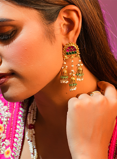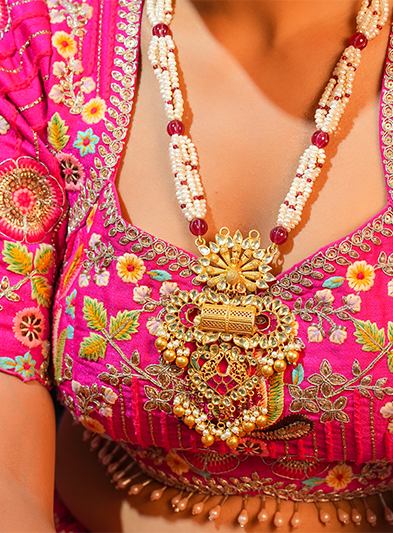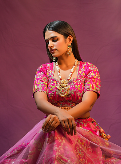 The Sunheri Mehfil Necklace is a captivating piece that embodies grandeur and traditional allure. This necklace features a rich combination of gold and gemstone detailing, highlighted by an intricately crafted central pendant that exudes opulence. The unique arrangement of beads and embellishments adds depth and elegance, making it perfect for weddings, festivals, and grand celebrations. The Sunheri Mehfil Necklace brings a touch of heritage and regal sophistication to any ensemble, ensuring the wearer stands out with timeless beauty and grace.